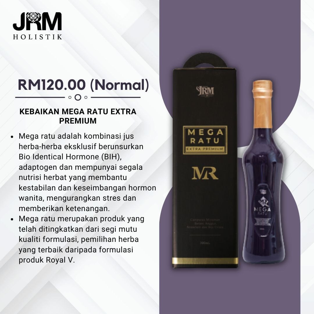 1. Mega ratu adalah kombinasi jus herba-herba eksklusif berunsurkan Bio Identical Hormone (BIH), adaptogen dan mempunyai segala nutrisi herbat yang membantu kestabilan dan keseimbangan hormon wanita, mengurangkan stres dan memberikan ketenangan.